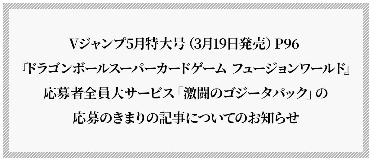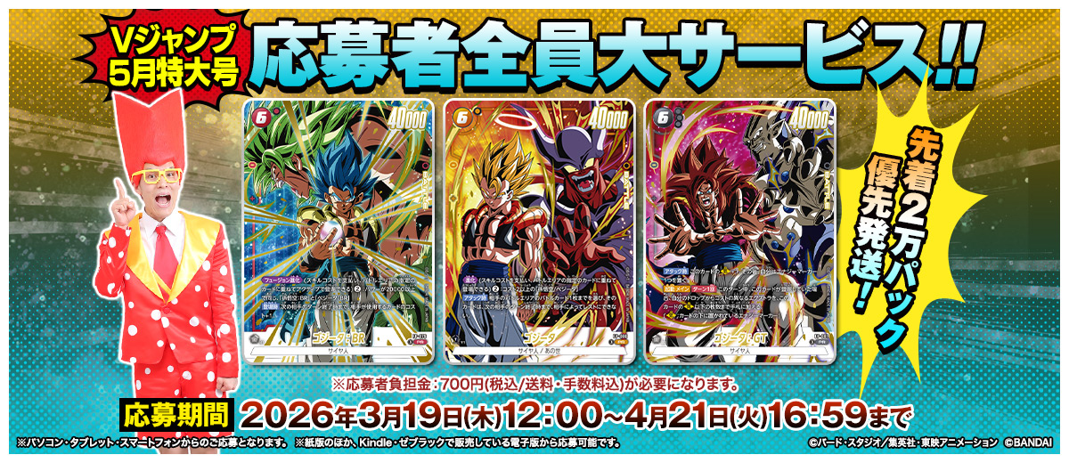 Vジャンプ5月特大号で『ドラゴンボールスーパーカードゲーム フュージョンワールド』の応募者全員大サービスをゲットしよう! 「ゴジータ」「ゴジータ:GT」「ゴジータ:BR」の3大ゴジータを封入した「激闘のゴジータパック」だ!!