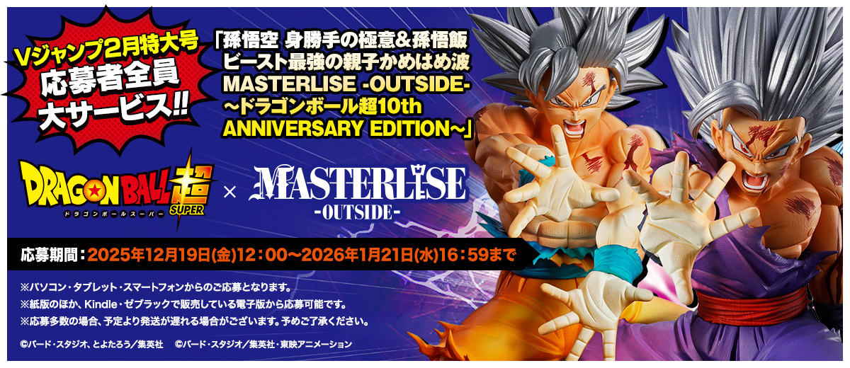 Vジャンプ2月特大号で『ドラゴンボール』の応募者全員大サービスをゲットしよう! 漫画『ドラゴンボール超』連載10周年を記念する、とよたろう先生描き下ろしの「孫悟空 身勝手の極意&孫悟飯 ビースト」の最強形態による“親子かめはめ波”を立体化した特別フィギュアが登場だ!!