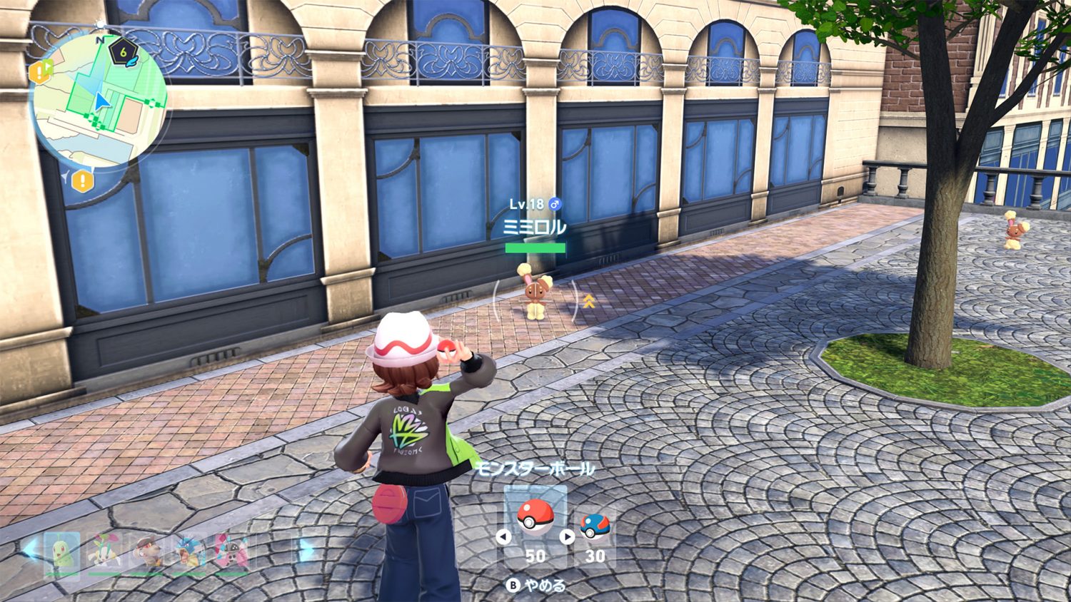 今回のエリアだと花壇や車を隠れる場所として利用できるが、全体的に開けた場所なので相手に見つからずに接近するのが少し難しい。そのため、しゃがみながら移動しつつ、トレーナーが別方向へ向いたり移動したりするのを待つ必要もあった。ただあくまでトレーナーに見つからなければいいっぽく、そばにいるポケモンに気づかれても発見状態にならずに済んだ。