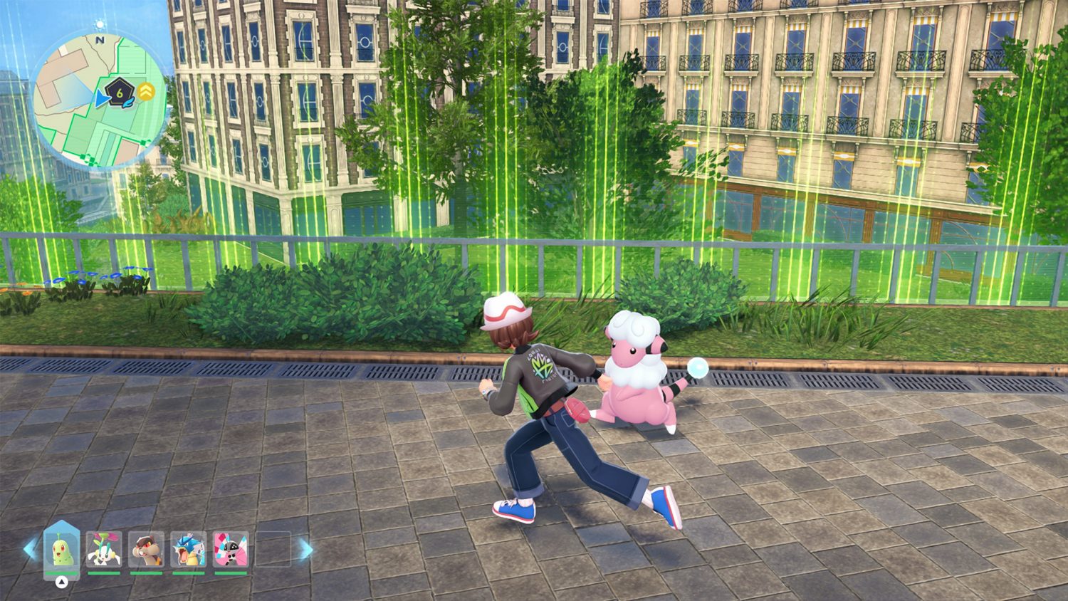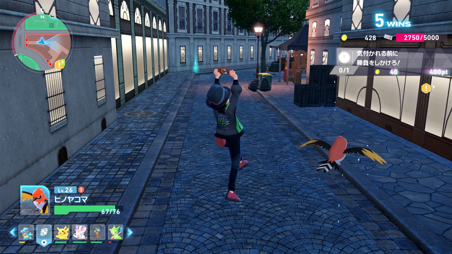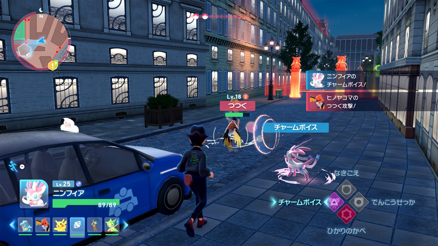 ここでの戦闘で車や花壇など遮蔽物越しに技を繰り出すと遮られてしまうこともわかった。自分のポケモンの立ち位置に気をつける必要があるが、相手の攻撃を防ぐ手段としても活用できるかもしれない。なお、トレーナーとの勝負ではポケモンの攻撃がプレイヤーに当たることはなさそうだった。