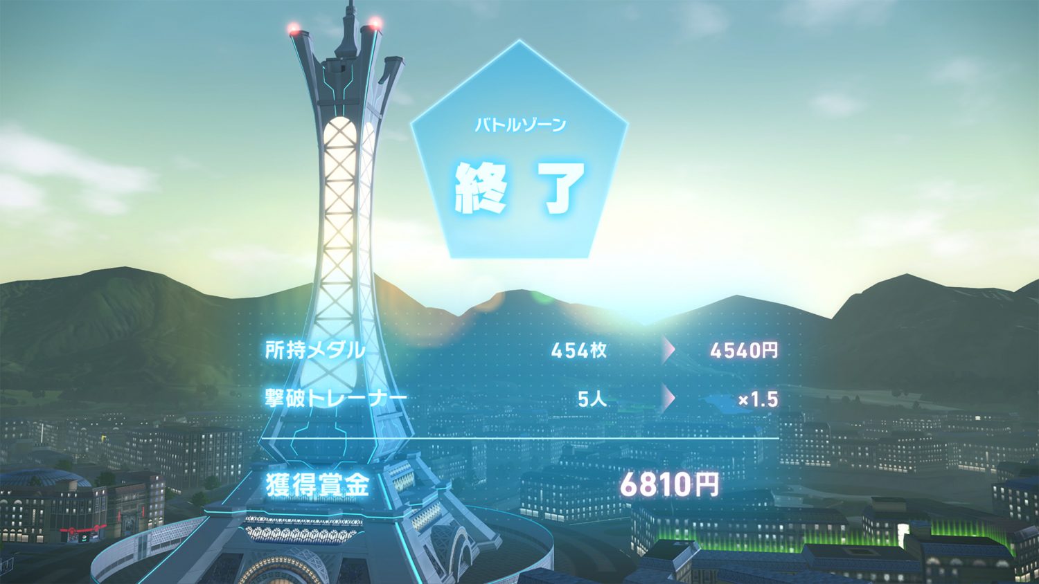時間が経過して夜が明けそうになると画面上部にアナウンスが入る。試遊開始から15分ほど経過するとZAロワイヤルが終わり、リザルト画面へ。獲得賞金は、入手したメダルの数✕10円に撃破したトレーナーの数によるボーナスが加算された値となっていた。