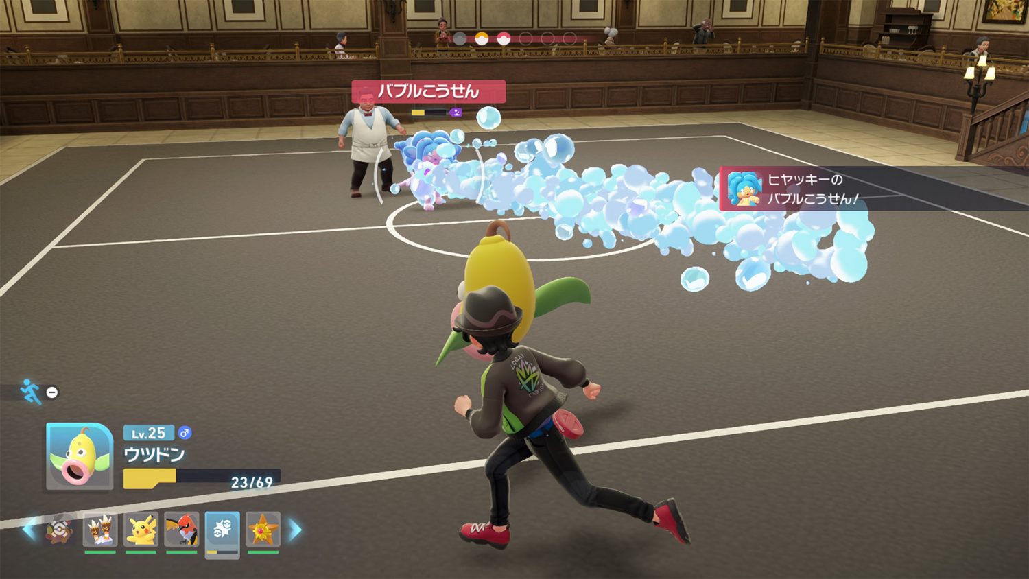相手トレーナーはポケモンの交代は行ってこなく、場に出ているポケモンを倒すと次のポケモンを繰り出してくる。その際、ボールから出てくるまで若干時間があるので、その間にこちらも交代したり、技を使っておくといったこともできた。リアルタイムゆえにちょっとした時間の使い方も大事ではないだろうか。