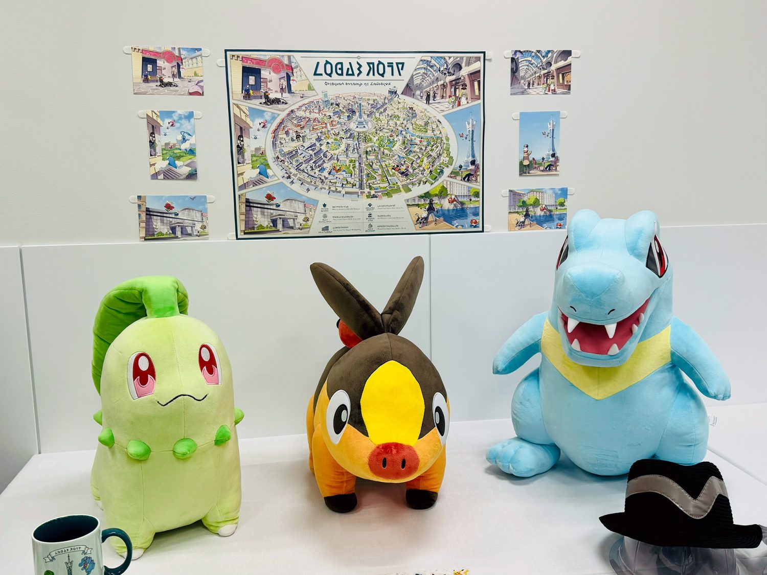 A2ポスター&ポストカード6枚セット ミアレシティのマップ(1980円)、ぬいぐるみ 等身大チコリータ(7700円)/等身大ポカプ(7700円)/等身大ワニノコ(8800円)