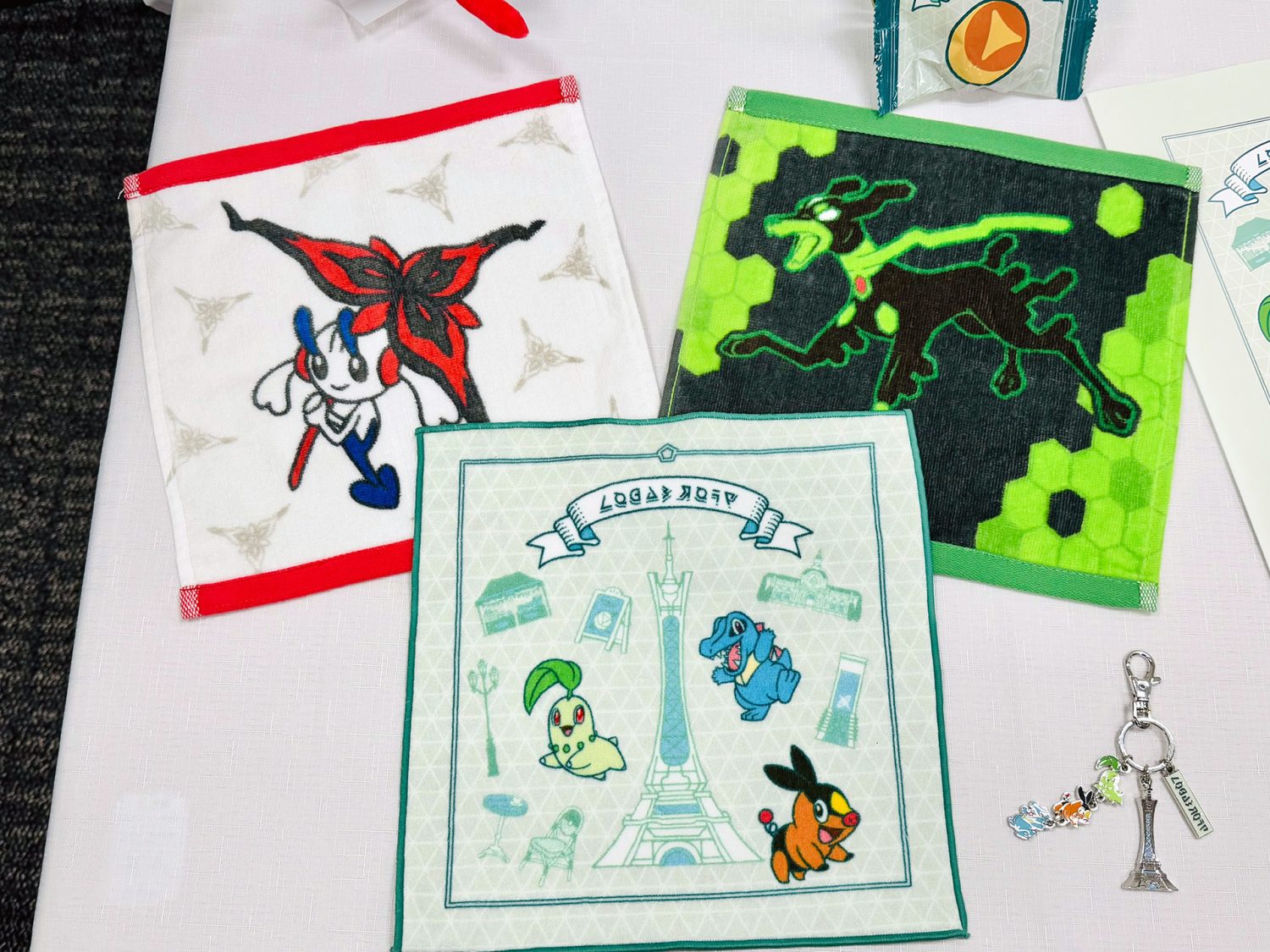 【選べる】ハンドタオル フラエッテ(えいえんのはな)/ミアレシティのポケモンたち/ジガルデ(10%フォルム) (各660円)、メタルキーホルダー プリズムタワー&チコリータ・ポカブ・ワニノコ(1320円)