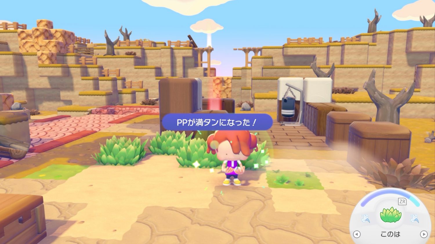 「はねる」はジャンプ。今回の試遊では最初から使用できたが、本来はゲームを進めることで使えるようになるらしい。また、ゲーム内の操作設定でBボタンとRボタンのアクションを逆にすることも可能。個人的にはBボタンでジャンプのほうがしっくりくる。