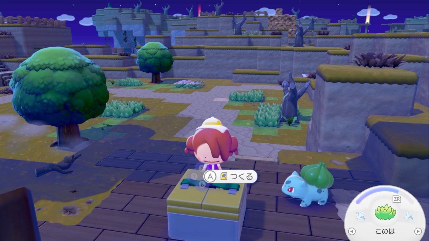 街に落ちている材料などはYボタンで拾え、Yボタンを長押しするとメタモンが吸い込んで(!)たくわえた状態になる。Xボタンでバッグを開いて家具を選択することでも、メタモンがたくわえた状態になり、その状態からAボタンで「はきだす」をすれば任意の場所に設置することが可能だ。