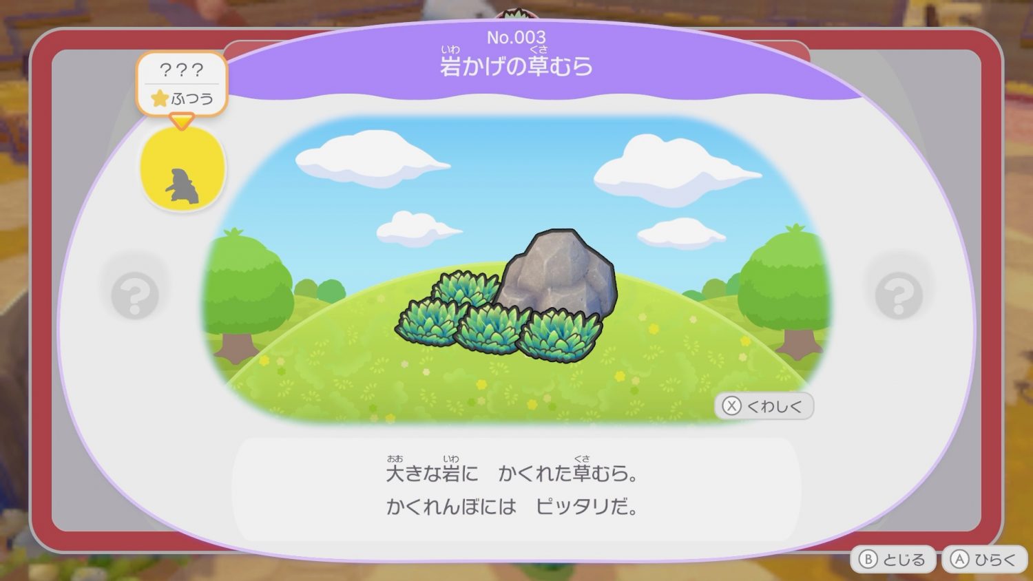 生息地ずかんを参考に生息地を作る。この「木かげの草むら」の場合、木がある周辺に草を4つ配置することでよみがえるということになる。