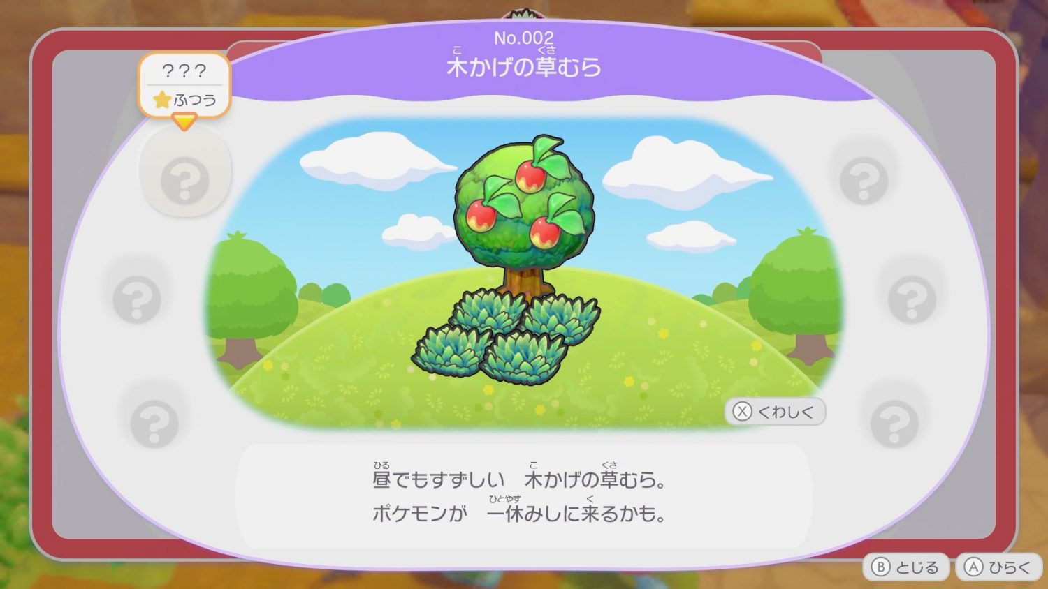 ということで木の周辺にわざの「このは」を使って草を配置。生息地ずかんと必ずしも同じ配置ではなくてもいいようで、木の近くに草が4つ配置されていればいいようだ。
