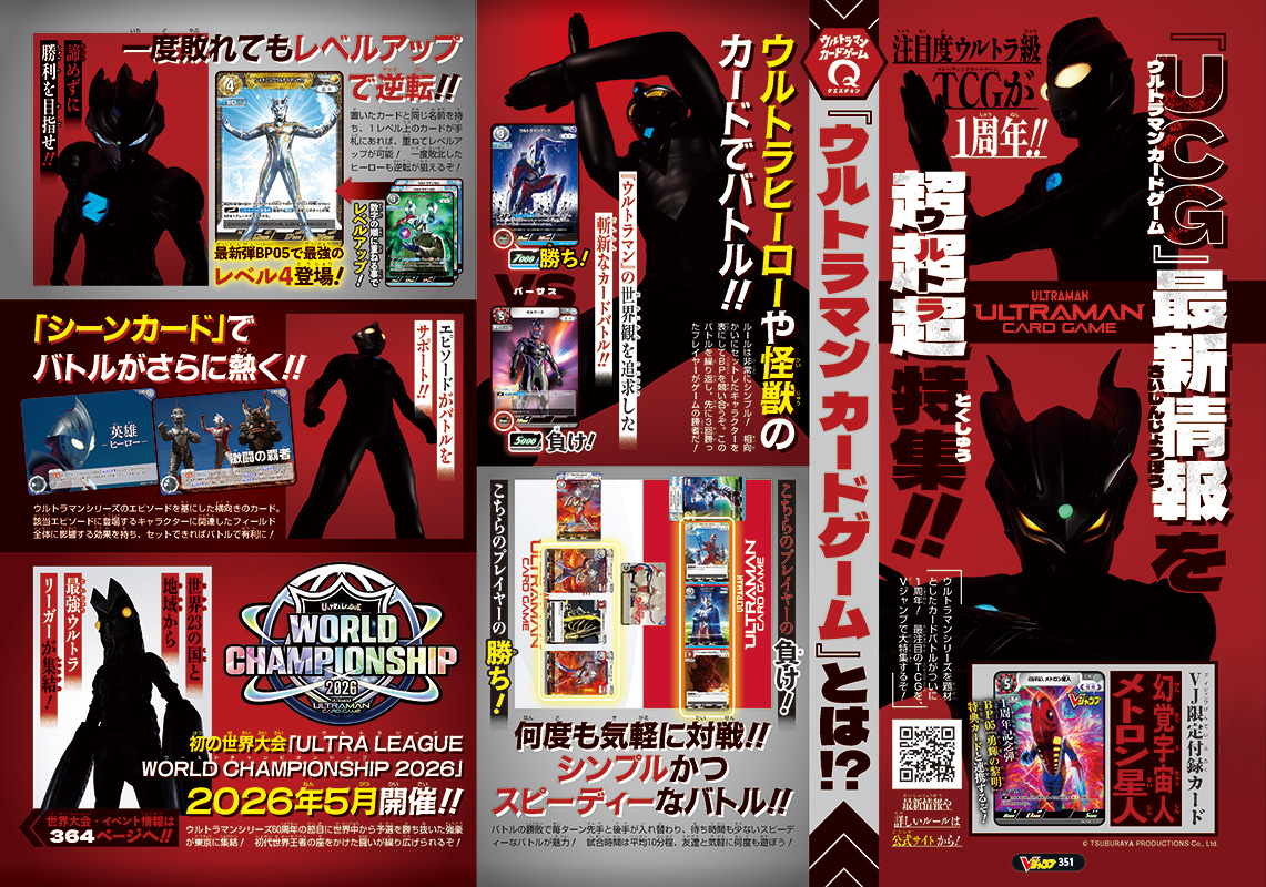 誌面では、ついに1周年の『ウルトラマン カードゲーム』を大特集! 遊び方や参戦ヒーローたちの戦い方を一挙紹介しているぞ!! さらに、10月31日(金)発売のブースターパック「勇輝の黎明」から、レベル3を超えるレベル4のウルトラヒーローを紹介! そのほか、12月19日(金)発売の超豪華構築済みデッキ「ウルトラマンティガ&ウルトラマンブレーザー」のセット内容など、『ウルトラマン カードゲーム』の見逃せない情報が満載だ!!