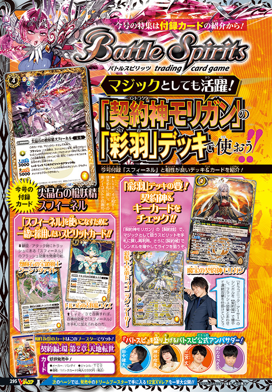 Vジャンプ12月特大号についてくる『バトルスピリッツ』の付録カードは、「尖晶石の槍妖精(せんしょうせきのそうようせい)スフィーネル」!! 系統:「彩羽」を持つこのスピリットはマジックカードとしても扱うことができ、フラッシュ効果でLv2/Lv4の相手のスピリット/アルティメット1体を手札に戻せる! そして、このフラッシュ効果発揮後、このカードをコストを支払わずに召喚可能だ!! マジックとして扱うスピリットを再利用できる「魔宝(まほう)の契約神(コントラクター)モリガン」をはじめ、「コイズ」や「クーン・ツァイト」など、好評発売中の「契約編:環 第2章 天地転世」に収録された相性抜群のカードたちと組み合わせて活躍させよう!!
