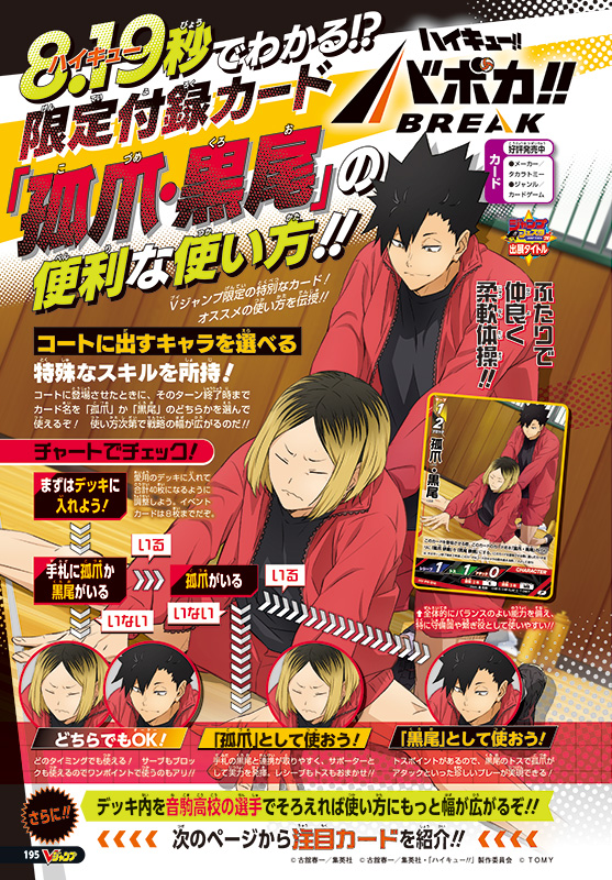 Vジャンプ1月特大号の『ハイキュー!! バボカ!! BREAK』付録カードは、音駒(ねこま)の幼馴染コンビ「孤爪(こづめ)・黒尾(くろお)」! このカードは登場させる際、そのターン終了時までこのカードのカード名を「孤爪(こづめ)・黒尾(くろお)」の代わりに「孤爪 研磨(こづめけんま)」か「黒尾 鉄朗(くろおてつろう)」にすることができる!! 手札にほかの「孤爪(こづめ)」か「黒尾(くろお)」がいないときに、その代わりとしてチームの戦略を拡げることができる便利な1枚だ!