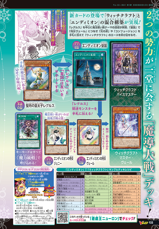 誌面では、12月20(土)発売の召喚方法をイメージしたデザインのアイテムと汎用性の高いカードが封入されたDUELIST BOX「PRISMATIC SUMMON」から、再録カードリストを掲載! さらに、2026年1月24日(土)発売の過去に登場したテーマの新規カードを多数収録した「BLAZING DOMINION」で大進化する「列車」と「妖精伝姫(フェアリーテイル)」の情報を紹介!! そして、同じく2026年1月24日(土)発売の「霊使い」をサポートするカードが一気に手に入る「THE CHRONICLES DECK -精霊術の使い手-」から、新規イラストが描き下ろされた「四霊使い」をはじめ、注目の再録カードもまとめているぞ!! そのほか、プロモーションショートアニメシリーズの続報やグッズの最新情報など、デュエリスト必見の内容が満載!!