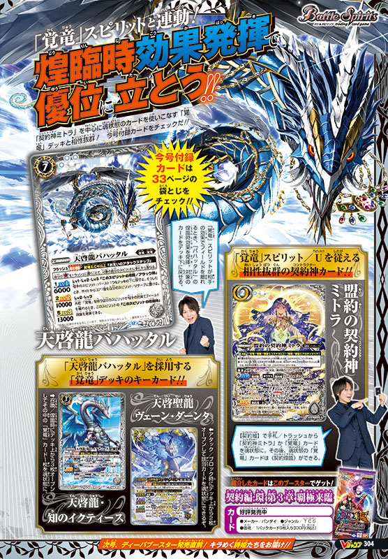 Vジャンプ2月特大号についてくる『バトルスピリッツ』の付録カードは、「天啓龍(てんけいりゅう)バハッタル」!! このカードは、『このスピリットの煌臨(こうりん)/アタック時』効果で、相手のスピリット/バースト1つをデッキの下に戻し、ボイドからコア1個を自分のスピリット/リザーブに置くことができる! さらに、系統:「覚竜(かくりゅう)」を持つ自分のスピリットが相手の効果でフィールドを離れるとき、このスピリットの『このスピリットの煌臨(こうりん)時』効果を発揮することも可能だ!! 「覚竜(かくりゅう)」スピリット/アルティメットを従える「盟約の契約神(コントラクター)ミトラ」をはじめ、「天啓聖龍(てんけいせいりゅう)ヴェーン・ダーンタ」や「天啓龍(てんけいりゅう)・知のイクティース」などの「覚竜(かくりゅう)」スピリットと組み合わせて優位に立とう!