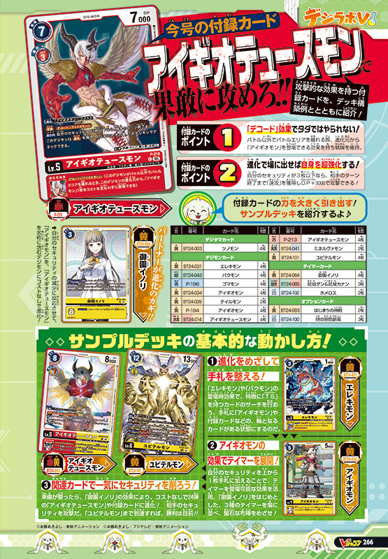 Vジャンプ3月特大号についてくる『デジモンカードゲーム』の付録カードは、「アイギオテュースモン」! 進化時、自分のセキュリティが3枚以下なら、相手のターン終了までこのデジモンは「速攻」を得て、DP+3000した上でアタックできるぞ!! さらに、バトル以外でバトルエリアを離れる際、進化元から「アイギオモン」を登場できる「デコード」効果を持っており、戦線を維持できるのも強み! 「アイギオモン」を、「アイギオテュースモン」を名称に含むデジモンに進化するのをサポートできる「御園イノリ」と組み合わせて活躍させよう!!