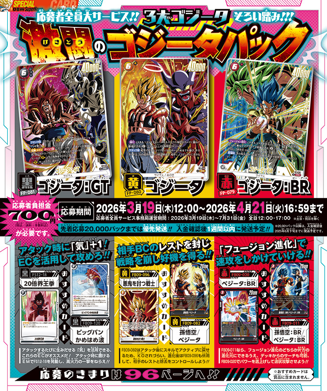Vジャンプ5月特大号の『ドラゴンボールスーパーカードゲーム フュージョンワールド』応募者全員大サービスは、豪華イラストの3大ゴジータ「ゴジータ」「ゴジータ:GT」「ゴジータ:BR」のカードを封入した「激闘のゴジータパック」!!