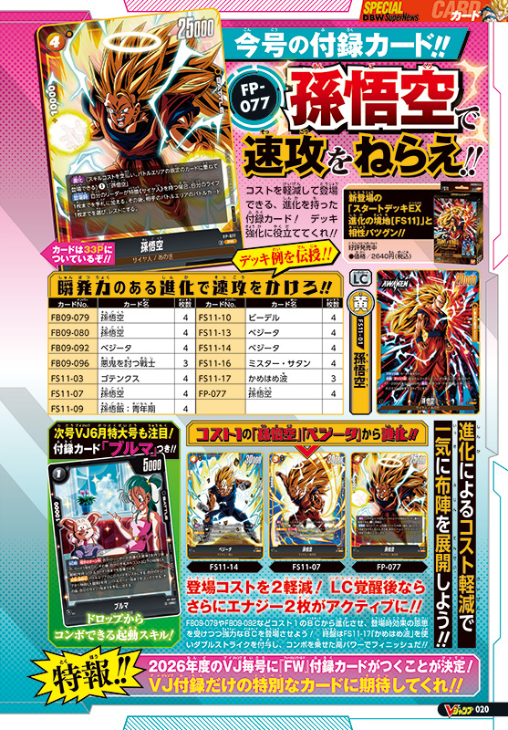 誌面では、付録カードとリーダーカード「[FS11-01]孫悟空」を使った黄デッキのレシピを大紹介! さらに、好評発売中のブースターパック「DUAL EVOLUTION [FB09]」から、希少度MAXのSCR(シークレットレア)スーパーパラレルをはじめ、ビジュアルパラレルやリーダーカードパラレルを一挙大公開!! そのほか、3大ゴジータそろい踏みの応募者全員大サービスなど、『ドラゴンボールスーパーカードゲームフュージョンワールド』の見逃せない情報が盛りだくさん!