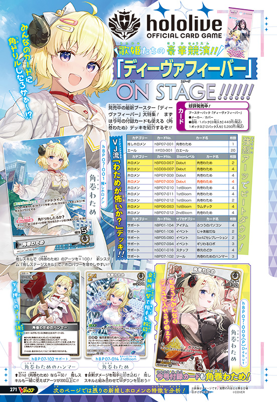 誌面では、付録カードを使ったVジャンプ流「わためが怖いか?」デッキのレシピと戦い方を紹介!! さらに、最新ブースターパック「ディーヴァフィーバー」収録の推しホロメン6名と、4種のSEC(シークレット)を大公開しているぞ!