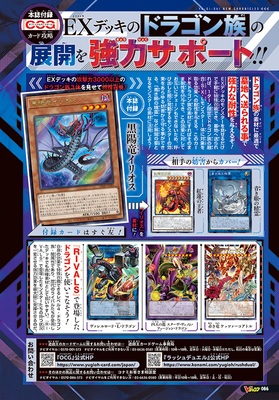 Vジャンプ6月特大号の『遊戯王OCG』付録カードはモンスターカード「黒陽竜(こくようりゅう)イリオス」! EX(エクストラ)デッキのドラゴン族を3体見せてこのカードを特殊召喚する効果と、ドラゴン族に対象耐性を与える効果、2つの効果でドラゴン族をサポートできる!!