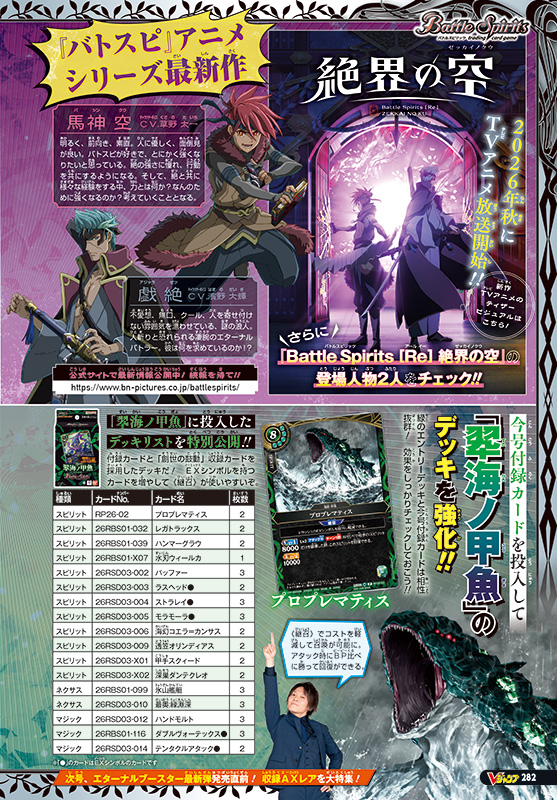誌面では、好評発売中のエントリーデッキ「翆海ノ甲魚」に、最新ブースター「創世の鼓動(そうせいのこどう)」収録カードと付録カードを採用したデッキリストを特別公開! さらに、同じく最新ブースター「創世の鼓動」 の収録カードで広がる各属性の戦い方やキーカードを一挙紹介!! そして、5月30日(土)発売予定のエターナルブースター「永皇の輝き(えいこうのかがやき)」から、生まれ変わり再登場する十二支をモチーフにした「十二神皇(じゅうにしんおう)」の一部を公開! そのほか、フォーマット別で開催中の公認大会の記念品紹介など、『バトルスピリッツ』の見逃せない情報が盛りだくさん!!